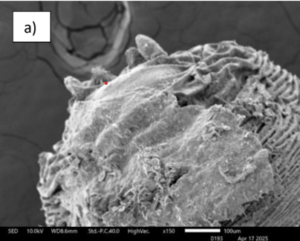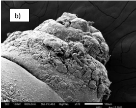 Figura 3. Scansioni al microscopio a scansione elettronica (SEM) di a) larve non esposte e b) di larve esposte all’applicazione del sistema Insectiblock® | |